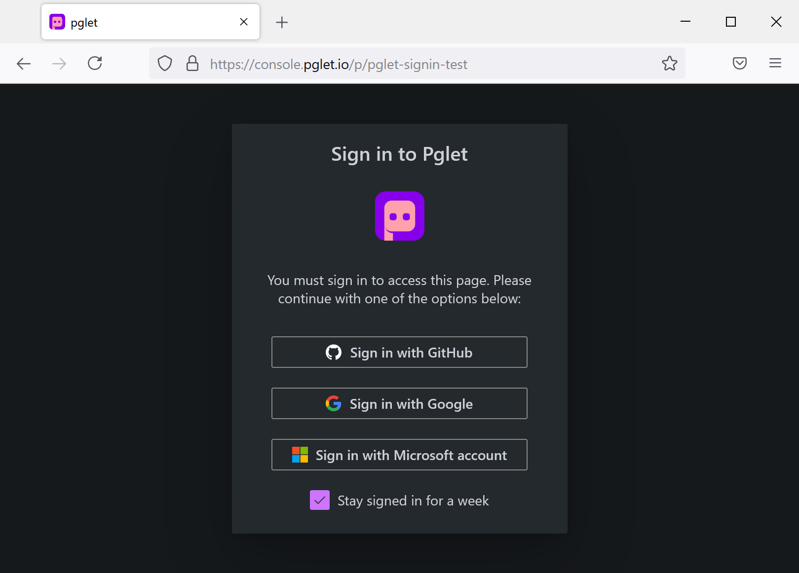 The major feature of Pglet 0.4.6 release is built-in authentication and authorization. Pglet now allows creating protected pages and apps which require users to sign in with any of three methods: GitHub, Google or Microsoft account (Azure AD):