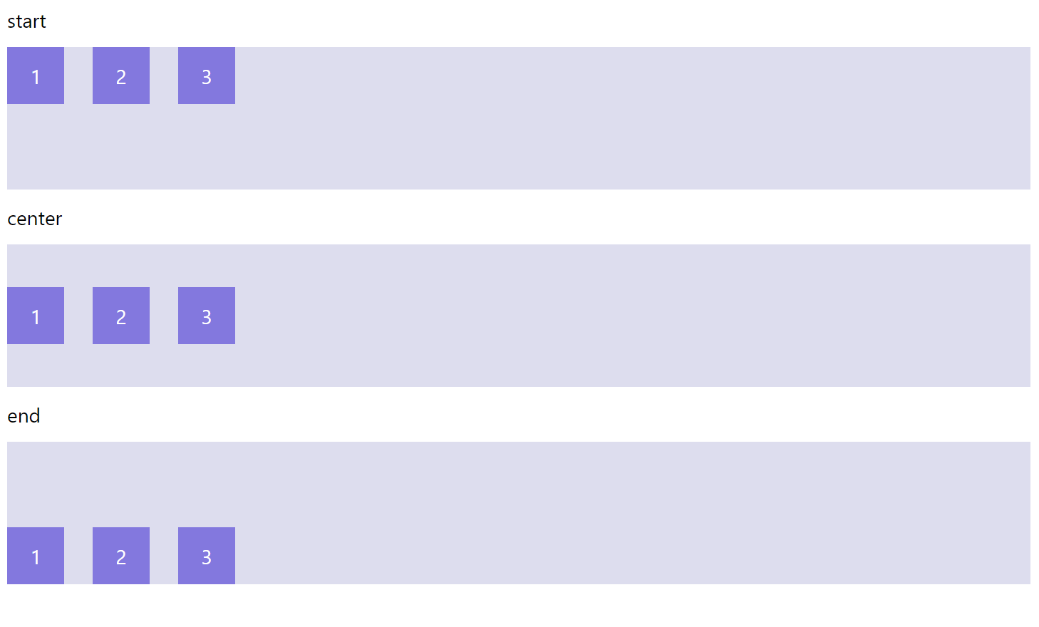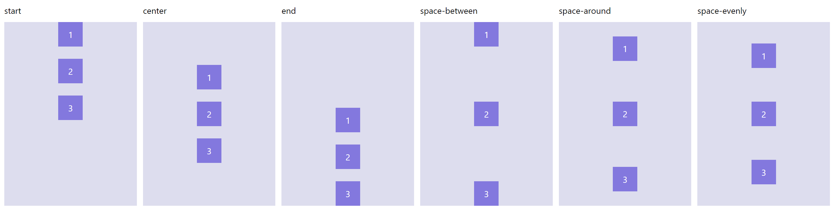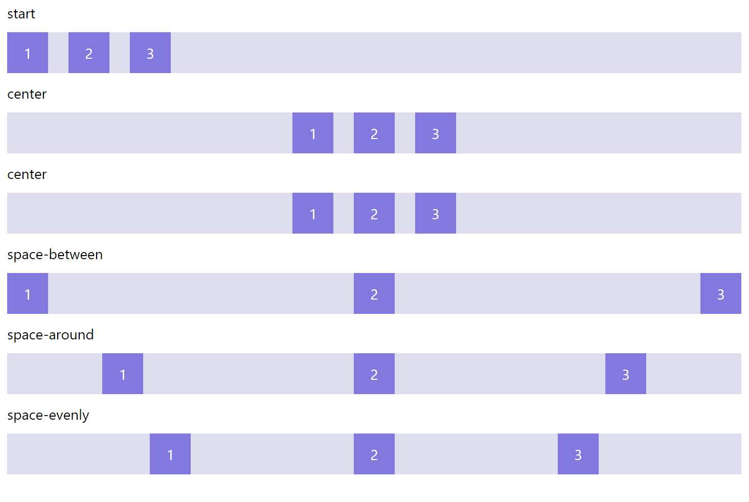 page.add(horizontal_stack('start'), horizontal_stack('center'), horizontal_stack('center'), horizontal_stack('space-between'), horizontal_stack('space-around'), horizontal_stack('space-evenly'))